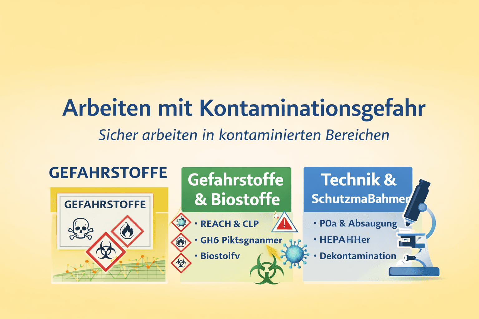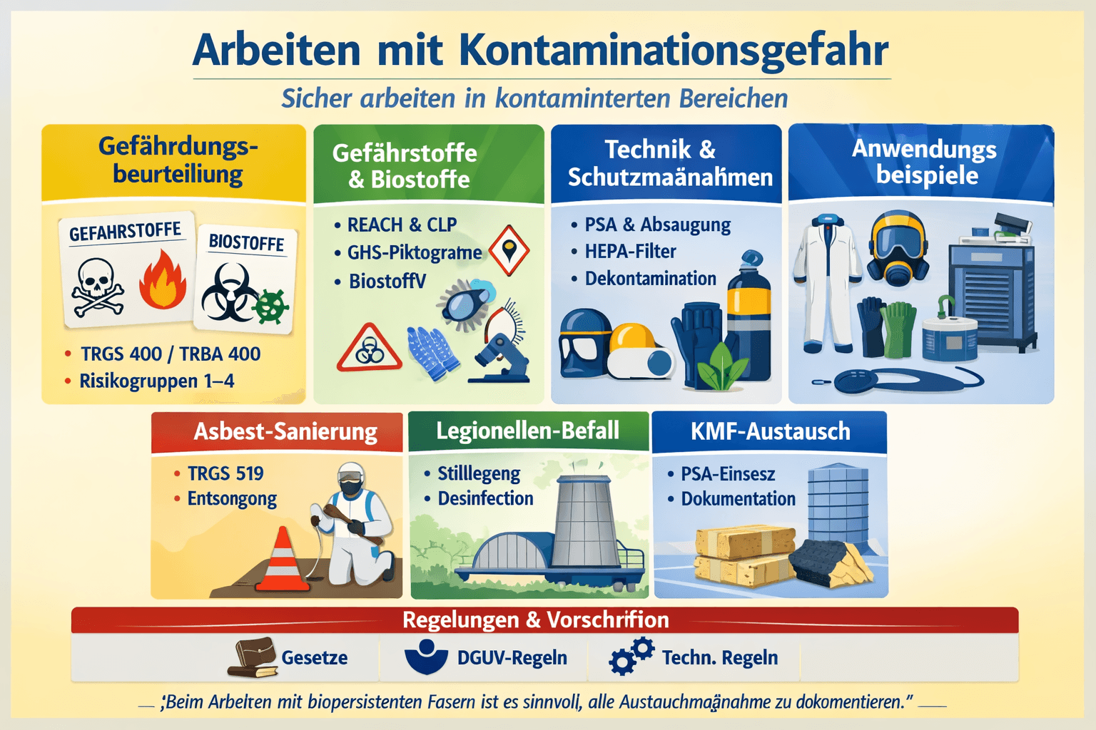 Kontaminierte Bereiche, Gefahrstoffe, Biostoffe, Asbest, KMF, Gefährdungsbeurteilung, TRGS 400, TRBA 400, BioStoffV, DGUV 101‑004, REACH, CLP, EMKG, Exposition, Risikogruppen, Hygiene, Dekontamination