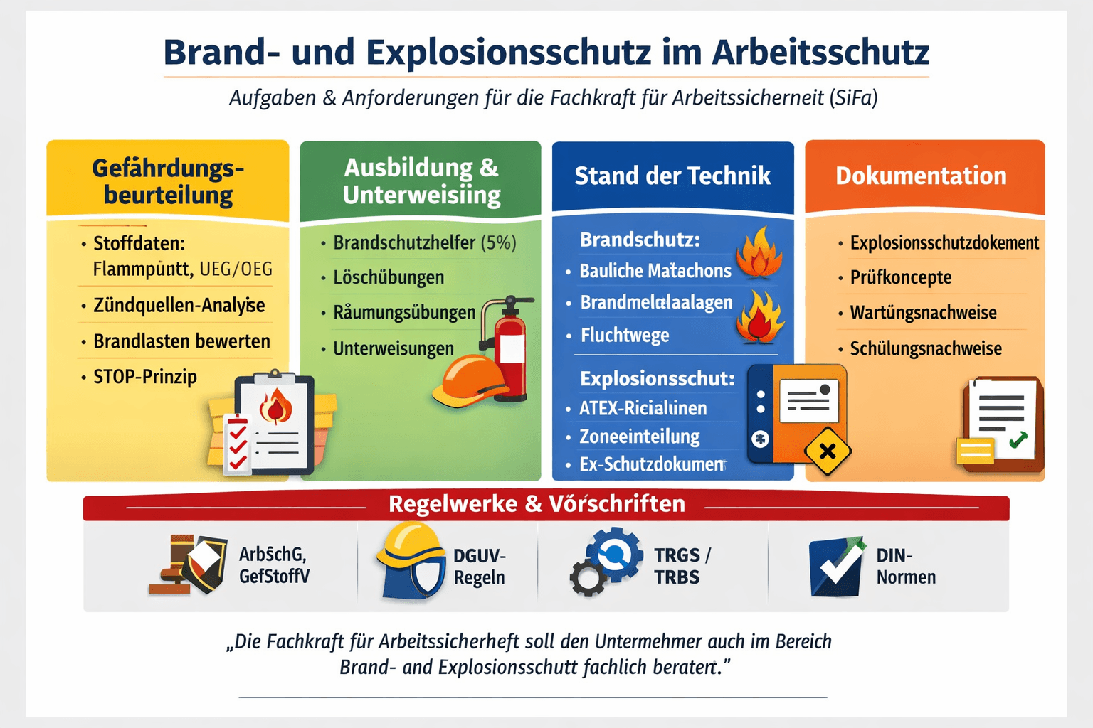 Brand- und Explosionsschutz, SiFa, Brandschutzbeauftragter, Gefährdungsbeurteilung, TRGS 800, ATEX, DGUV 205‑003, Brandklassen, Löschmittel, Explosionsschutzdokument, organisatorischer Brandschutz