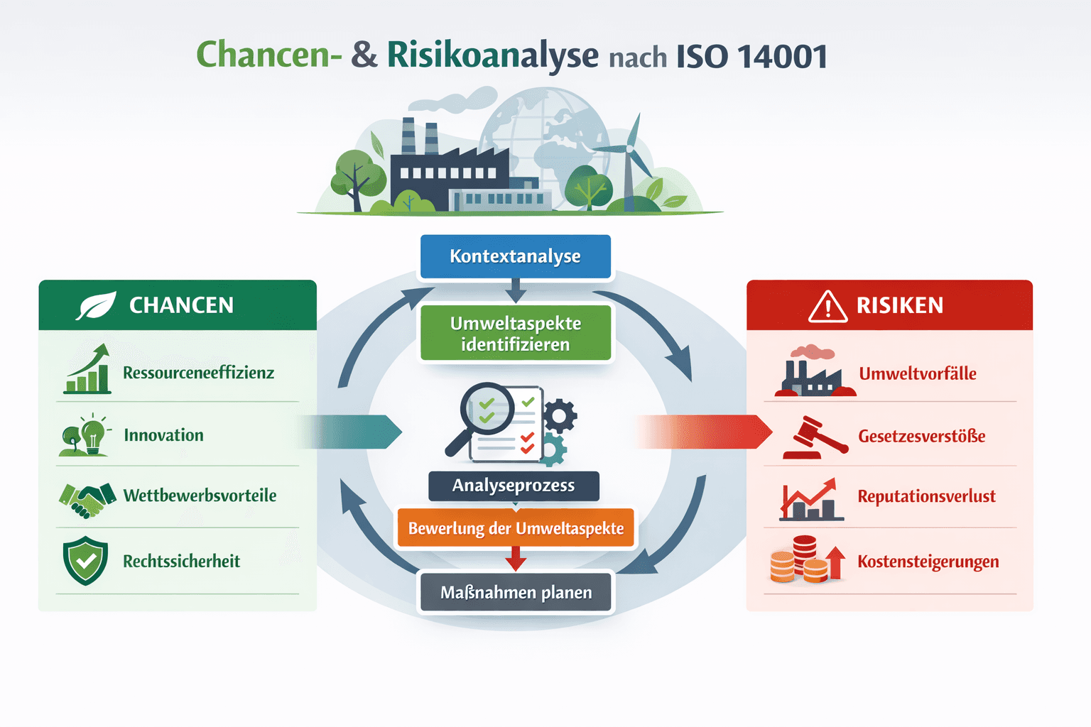 Die ISO 14001 verlangt, dass Organisationen Umweltaspekte, bindende Verpflichtungen, interne und externe Themen sowie die Erwartungen interessierter Parteien analysieren. Daraus ergeben sich sowohl positive Potenziale (Chancen) als auch Gefährdungen (Risiken) für Umweltleistung, Compliance und Unternehmensstrategie.