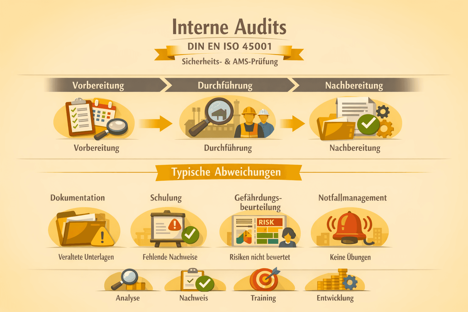 Interne Audits sind ein zentrales Element der DIN EN ISO 45001. Sie prüfen, ob das Arbeits‑ und Gesundheitsschutzmanagementsystem (AMS) wirksam funktioniert, gesetzliche Anforderungen erfüllt und kontinuierlich verbessert wird. Richtig geplant und durchgeführt, sind interne Audits nicht nur eine Normanforderung, sondern ein strategisches Werkzeug zur Sicherheitskultur, Risikominimierung und Prozessoptimierung.