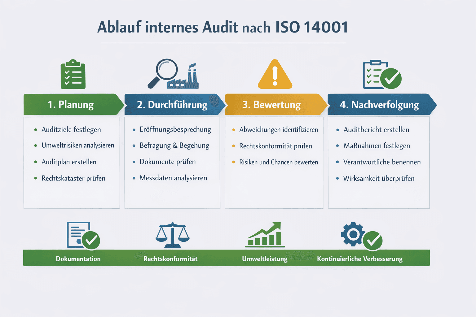 Interne Audits sind in Kapitel 9.2 der ISO 14001 verankert. Sie sollen sicherstellen, dass das Umweltmanagementsystem normkonform ist, Umweltaspekte gesteuert werden, rechtliche Verpflichtungen eingehalten werden und die Umweltleistung kontinuierlich verbessert wird.