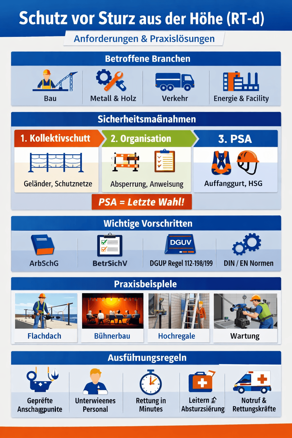Schutz vor Absturz, Sturz aus der Höhe, DGUV, BG‑Regel, Stand der Technik, Absturzsicherung, PSA gegen Absturz, Gefährdungsbeurteilung, Absturzkante, Sicherungssysteme, Rettungskonzept